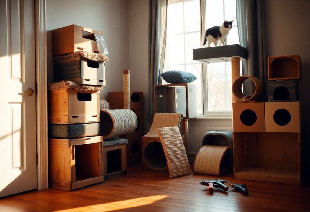 Gather inexpensive materials such as cardboard boxes, sisal rope, foam pads, thrifted blankets, and wooden crates. You can convert a cardboard box into a hideaway, wrap a plank with sisal for a DIY scratching post, and stack crates for climbing platforms. Salvage brackets and spare wood for stable platforms; these low-cost items form the backbone of a safe, fun DIY structure.