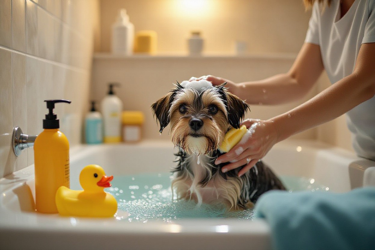 Brush thoroughly before bathing to remove mats, then place your dog on a non-slip surface and use lukewarm water (about 37°C / 98°F). Wet from neck to tail, apply shampoo sparingly, lather gently for 2–3 minutes, and rinse until water runs clear to avoid residue. Protect ears with cotton (don’t push deep) and avoid the eyes and muzzle. Use a handheld sprayer or cup for even rinsing and a towel nearby to reduce slipping.