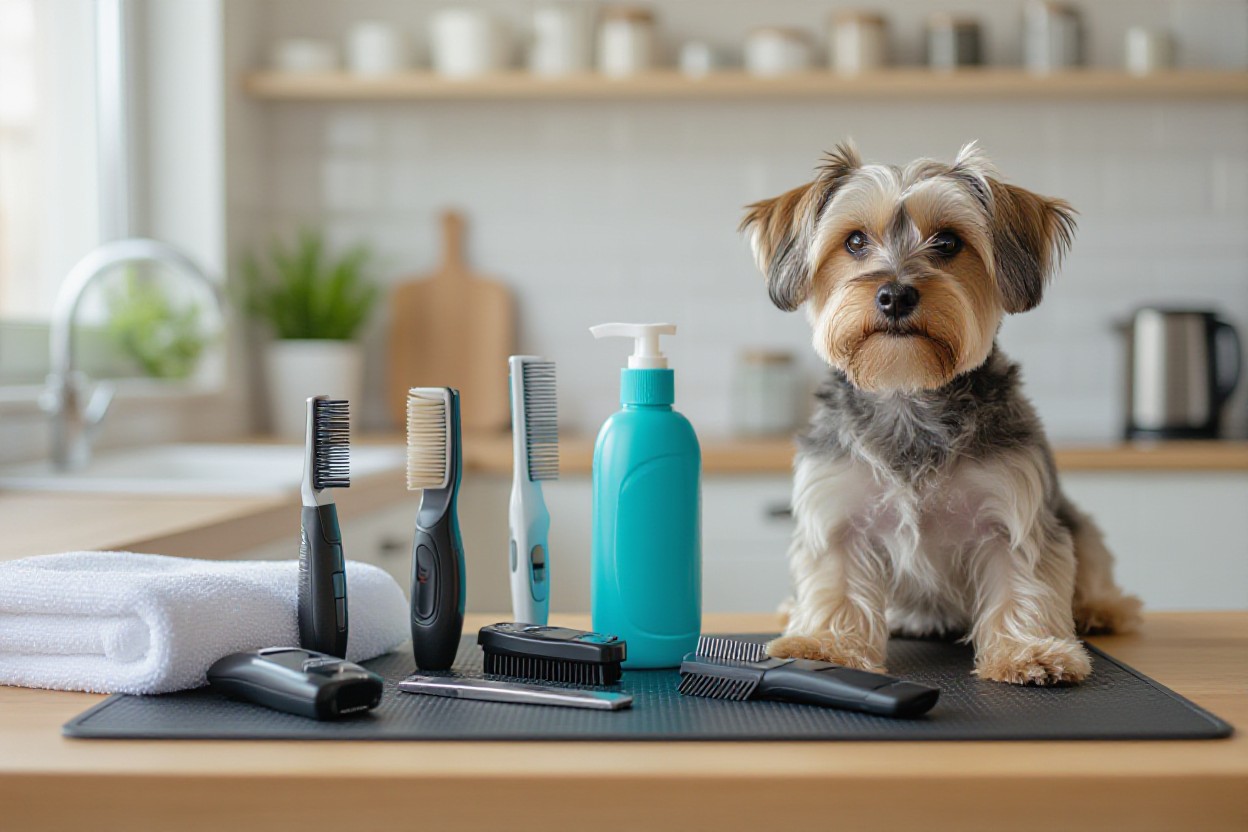 You should assemble a basic kit that covers brushing, cutting, bathing and first aid — expect about a $200 initial investment versus $50–$100 per professional visit. Include: a slicker brush, undercoat rake, steel comb, quality shears (6–7″ straight and thinning), clippers with spare blades, nail trimmer or grinder, high-velocity or force dryer, non-slip grooming mat, towels, ear-clean solution, styptic powder and treats to manage anxiety.