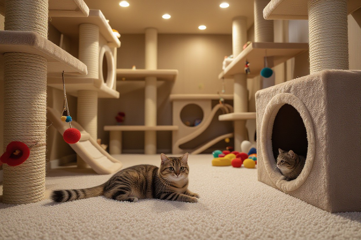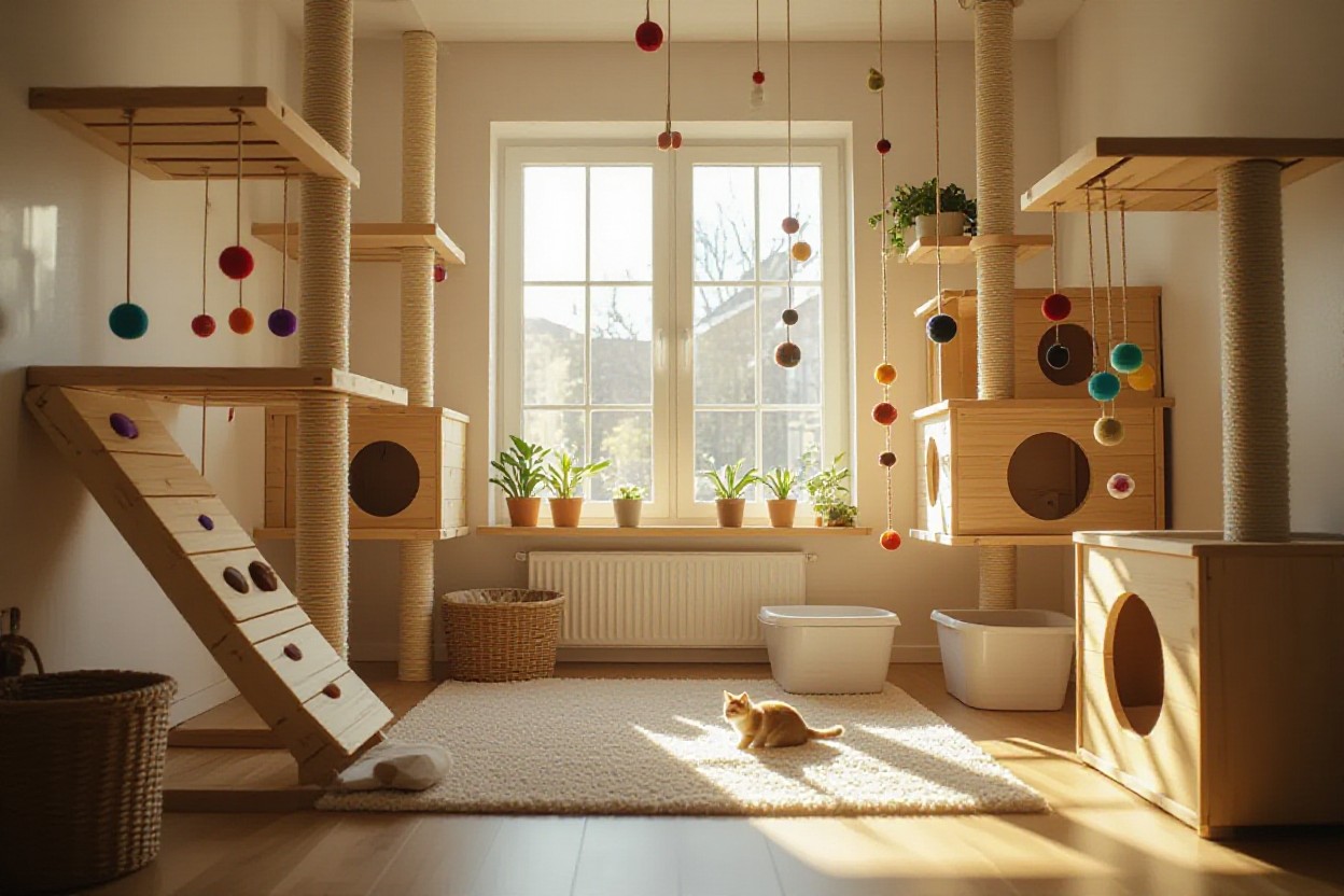 Place perches at varied heights (0.5 m, 1.0 m, 1.7 m) to match natural jump ranges (cats can leap multiple times their body length). Rotate toys weekly, use motion-activated LED or battery toys for solo play, and keep decorative items secured. Avoid dangling cords and small breakables — they’re dangerous choking hazards — and prefer anchored décor that both appeals to you and engages your cat.