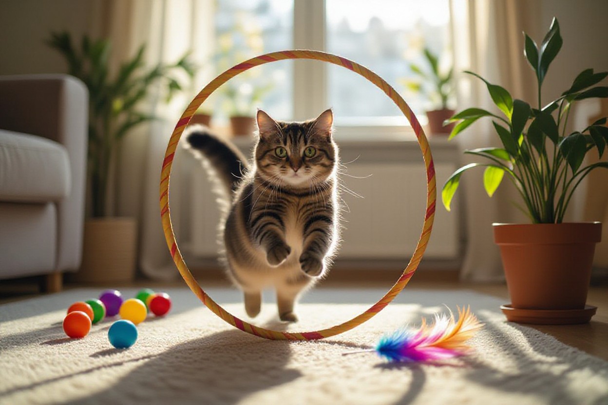 Use a hoop as a low-stress prop: start with the hoop on the floor and lure your cat with a high-value treat through the center, offering a click or marker the moment all four paws clear the rim. Train in short bursts of 3–5 minutes, aiming for 5–10 successful reps per session. Progress over 2–3 weeks by raising the hoop no more than 2–3 inches at a time; do not raise it above shoulder height to avoid strain.