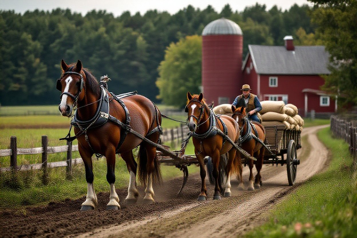 On a busy day, you might hitch a steady gelding to a forecart and make 10 or 12 trips from the hayfield, each load stacked with 60 to 80 small bales – that’s well over a ton per trip, and a fit draft horse handles it like a champ on level ground. You can also use a light two-wheel cart for quick runs: hauling buckets, tools, or poultry feed between barns, often faster than starting a tractor. And because horses are quieter and more controlled, cart work around other farm animals (like nervous cattle or sheep) is way less stressful than a loud engine charging through the yard.